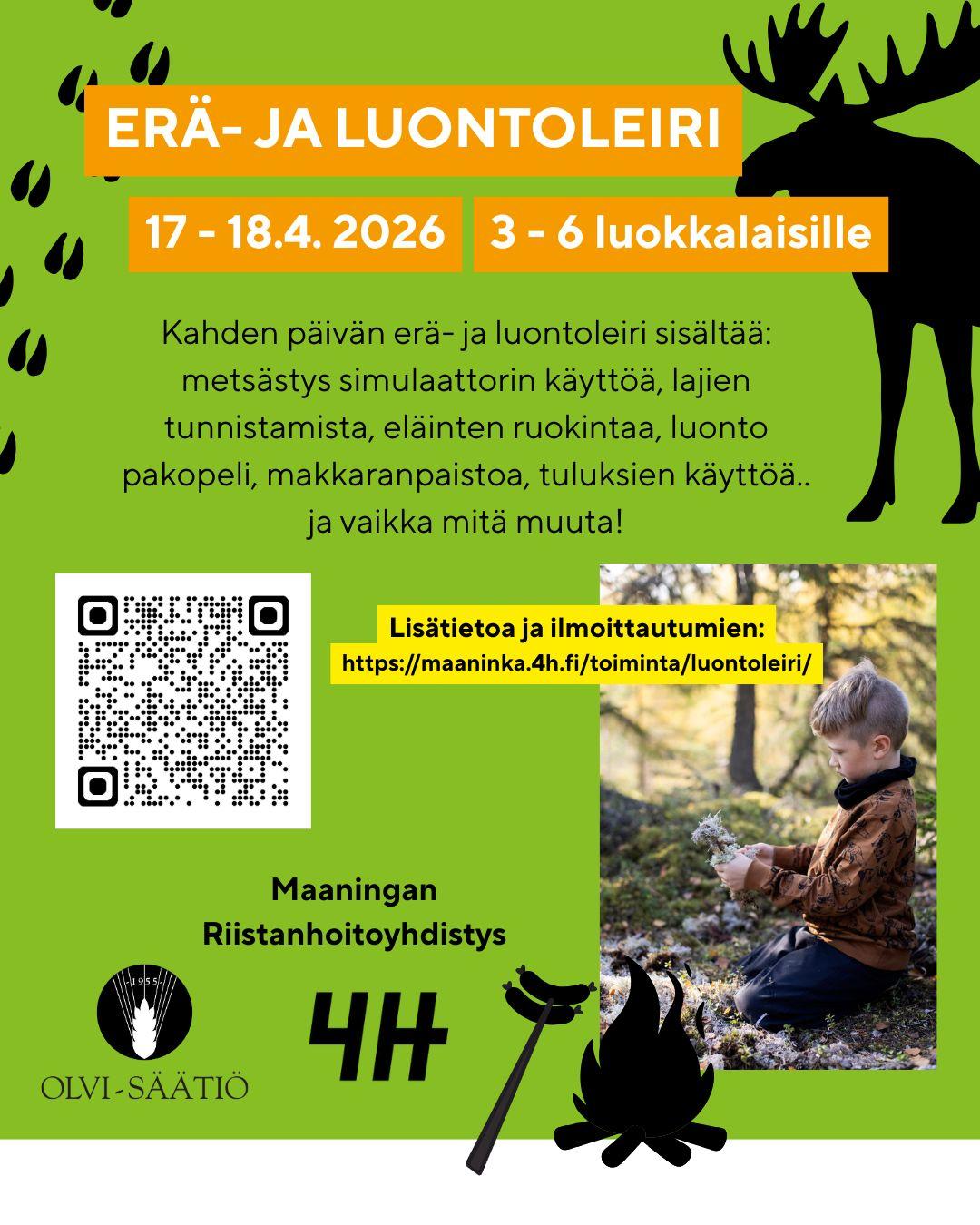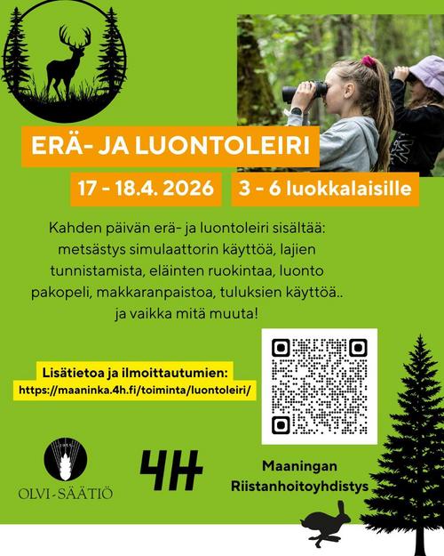Leiri järjestetään Maaningan riistanhoitoyhdistyksen kanssa ja leiriä on rahoittamassa Olvi-säätiö.